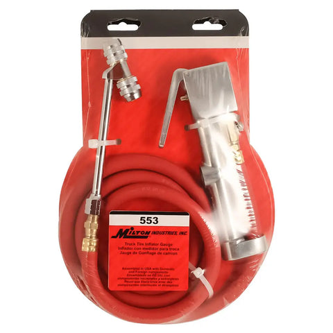 Milton 553 is a Heavy-duty Truck Tire Inflator Gauge with 5-feet Air Hose. Milton’s dual head lock-on chuck inflator gauge is ideal for servicing truck tires and heavy-duty inflation applications. Meeting OSHA standard 1910.77. This inflator gauge is equipped with a 5' hose assembly, a 6in swivel extended push on lock coupling, and a built-in deflator button.
