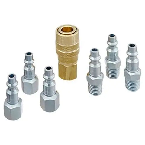 Seven-piece M style coupler kit includes various couplers and plugs with a 1/4in basic flow size. Milton M style Kwik Change couplers are made of brass, while the M style Kwik Change couplers are made of case hardened steel and are plated to resist rust. This collection of couplers, plugs will interchange with all manufacturers who comply with the dimensional requirements of military specification MIL-C-4109. Kit includes one 1/4in FNPT coupler, three 1/4in MNPT plugs, and three 1/4in FNPT plugs. M style couplers and plugs offer up to 300 PSI and have an air flow of 40 SCFM.