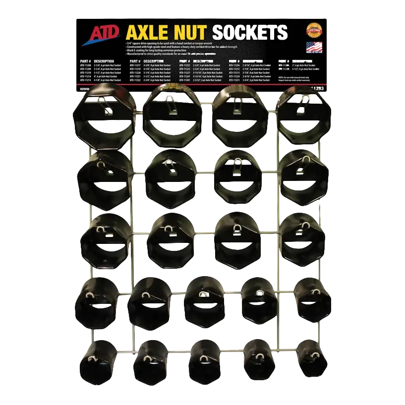 Need reliable axle nut sockets for suspension and brake jobs? The ATD 22 Pc. Axle Nut Socket Display (Part #11293) is a must-have for shops handling suspension and brake repairs. Made in the USA, this high-grade steel set features a 3/4-inch square drive, heavy-duty welded drive bars, and black E-coating for long-lasting corrosion protection. Built to strict quality standards, it ensures precise fits and reliable performance. The organized display measures 22.25in x 25.5in x 5in and comes with a lifetime warranty, making it a perfect addition to any professional shop.