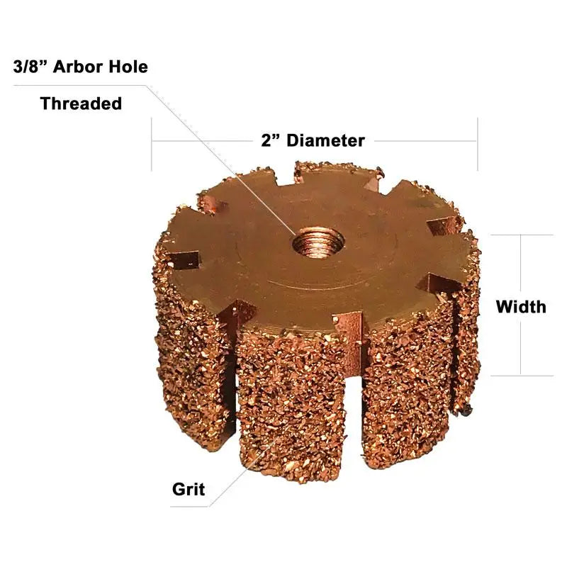These high-quality 2-inch diameter slotted tungsten carbide Finishing Rasps last a long time, and are entirely regrittable. Each size is available in 36 or 16 grit and all are set up for 3/8 inch arbor size. Threaded. Sold as Each.