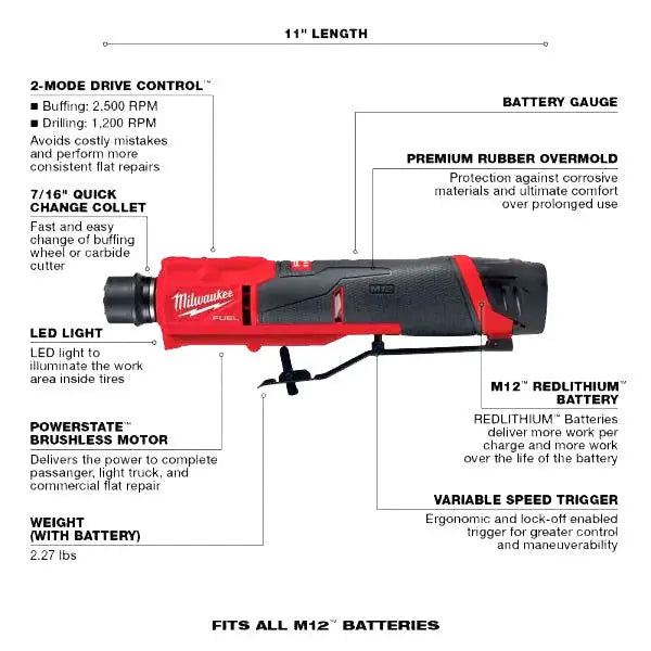 Our M12 FUEL™ Low-Speed Tire Buffer is the world's first cordless tire buffer, delivering performance, control, and runtime to replace pneumatic solutions in the shop. This cordless tire buffer provides you with greater access and mobility, eliminating the frustrations of hoses and compressors.