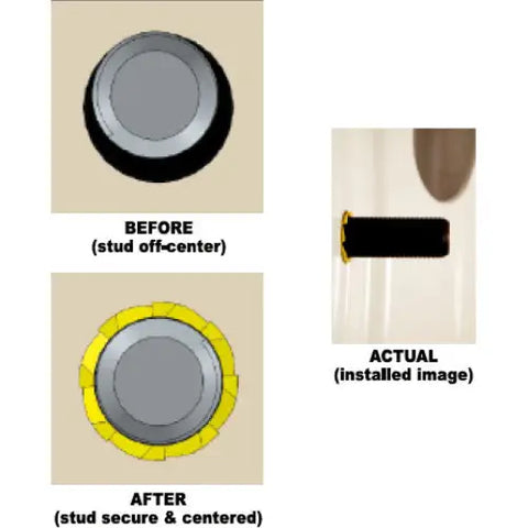 Polyamide wheel centering sleeves take up the gap between the 22mm stud and the 26mm wheel opening, realigning the wheel to the TRUE CENTER of the hub bearing.