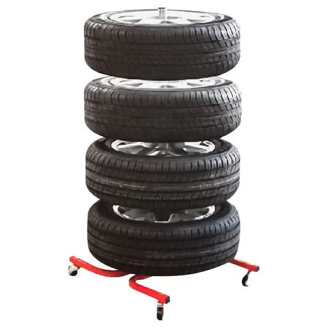 This tire display stand lets you show the tire tread designs of four tires, while also rolls easily on four heavy duty wheels.