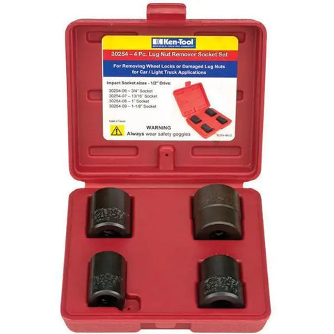 Ken-Tool 30254 - 4 Pcs. Lug Nut Remover Socket Set. Use for removing wheel locks or damaged lug nuts. Weight: 1.4 lbs (.6 kg). Made in Taiwan