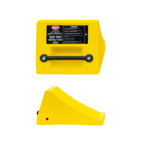 AME Yellow Polyurethane wheel chock with handle for tire size 47-inches to 165-inches.