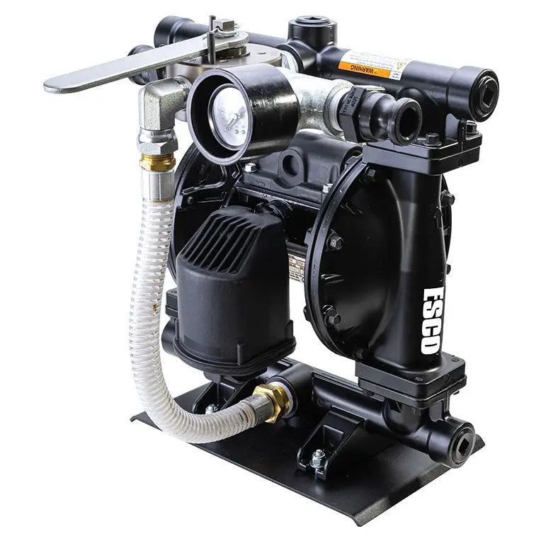 The ESCO Calcium Chloride Liquid Transfer Pump is designed to transfer up to 50 gallons per minute transferring fluid from one container to another quickly and easily. Works with multiple fluid applications including calcium chloride, water, methanol, oil, anti-freeze, coolants, tire liquids, and more. The design and functionality of Model 10543 are specifically designed for transferring calcium chloride or other mediums into tire/wheel assemblies to aid in creating ballast with the tire/wheel. Fully assembled and ready to use out of the box, this kit includes two 10 ft. hoses, a liquid ejector gun, quick safety-connection "cam-locks", a 4-way metal control valve, and an air regulator.