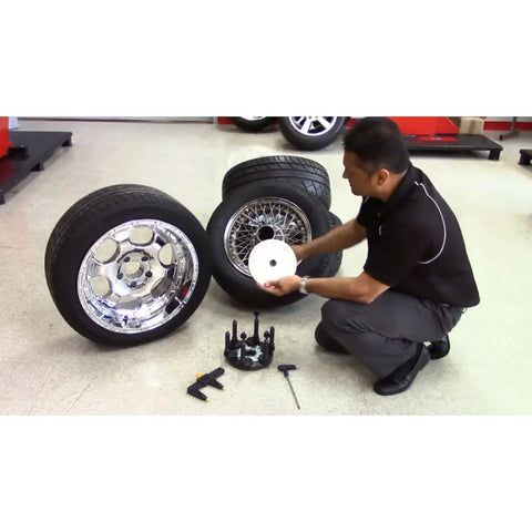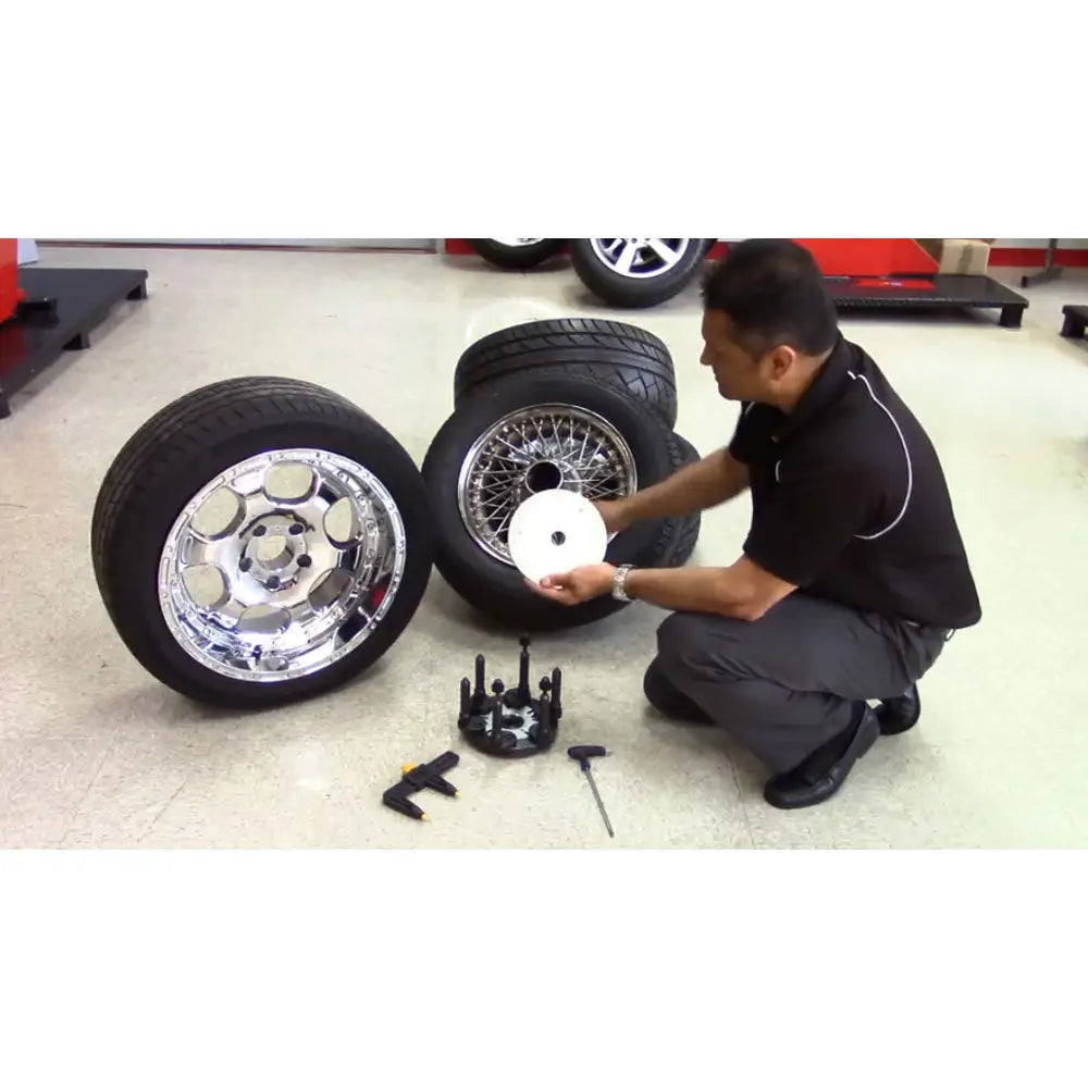 This adaptor is perfect for mounting wheels that must be positioned upside down. Whether you have wheels with a drop center in the rear or aftermarket wheels with deep, step, or multi-lip features, this adaptor will get the job done perfectly. The face of the wheel is the only part of the design that makes contact with the tabletop, and only the fingers on the adaptor make contact with the wheels. The kit comes with 6 removable fingers so that 4,5,6, and 8-lug wheels can all be mounted. Plus, an offset caliper is included for your convenience.