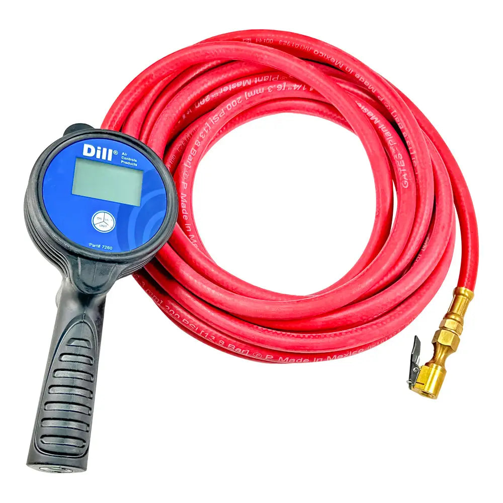 Need an extra-long reach tire inflator for your big shop? The Dill 7260-20-6293E Digital Inflator is your answer. This trusted professional shop tool features a rubber-coated handle for easy grip and an extra-long 20-foot USA-made hose for exceptional reach. It's perfect for inflating tires on large vehicles or in tight spaces without moving your compressor. With its USA-made Euro clip-on chuck and digital gauge (0-170 psi range), this inflator offers the precision and versatility you need. Get extra reach and convenience in one durable package.
