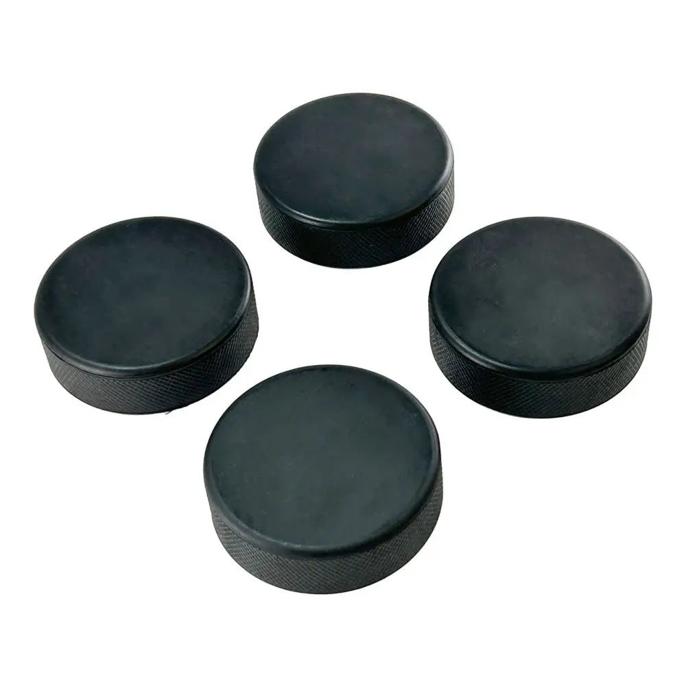 Set of four black circular speaker spikes or isolation feet with red O-rings.