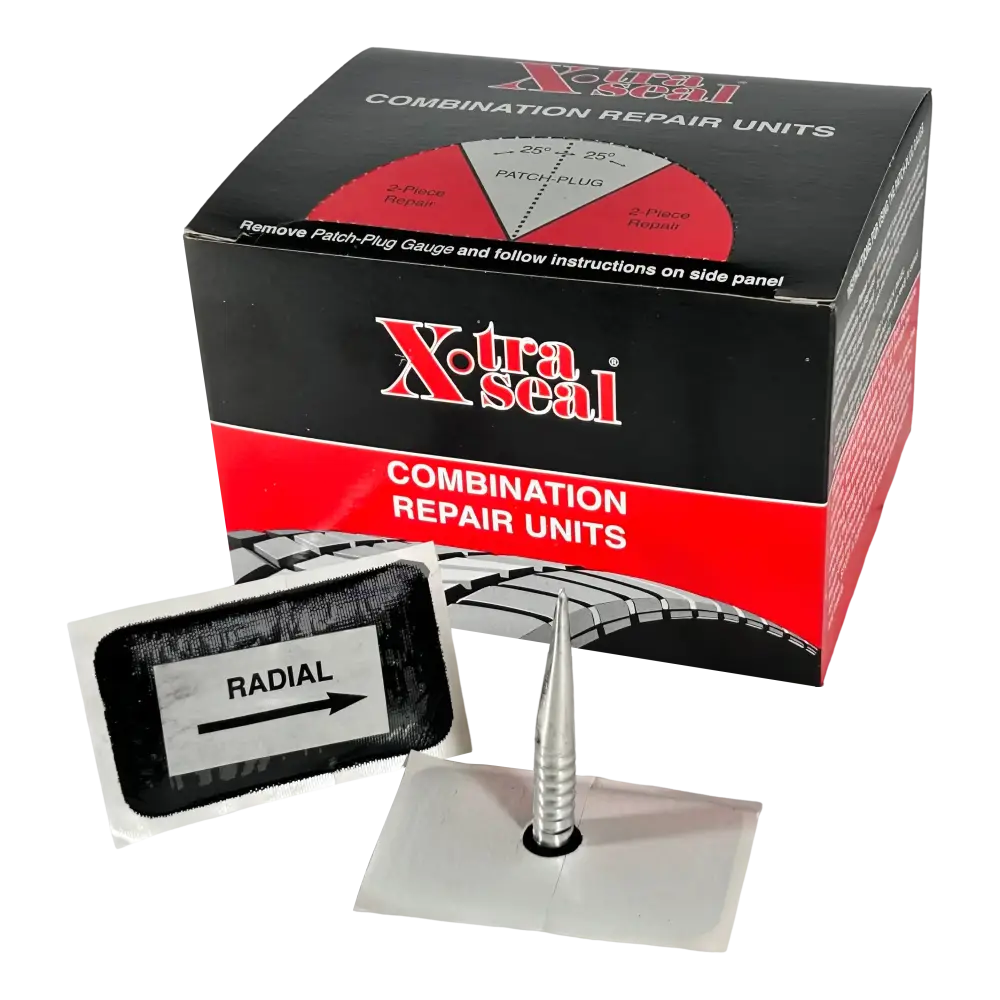 Need a reliable tire repair solution? The X-tra Seal 13-375 Radial Quilled Combination Unit is perfect for tire techs seeking strength and durability. This patch plug repair unit features a rectangular patch (1-5/8in x 2-7/8in) with a 5/16in round stem, designed for tread area repairs on radial tires that require cord reinforcement. Sold in boxes of 15, it uses black vulcanizing gum for chemical vulcanization, ensuring a strong, permanent seal. The metal quill makes installation easy, making it a top choice for professionals looking for effective, long-lasting repairs.